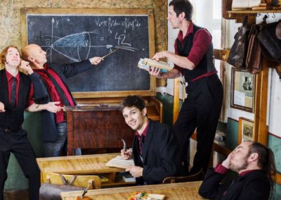 Feuerzangenbowle mit strengem Lehrer auf alten Schulbänken mit schwieriger Prüfung und Noten für Benehmen und Ordnung. Und alles in historisch eingerichteten Speiseräume, wie zu Uromas Zeiten.