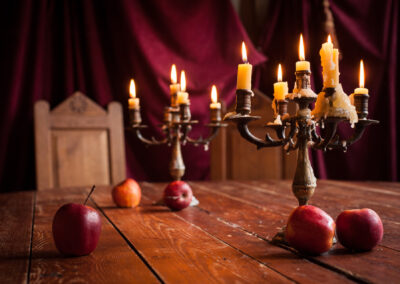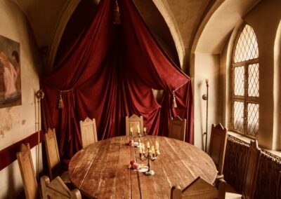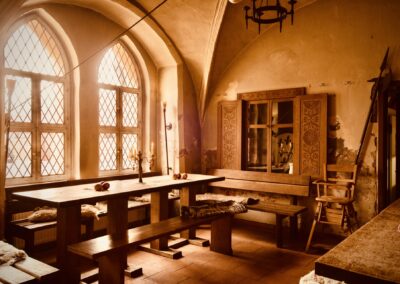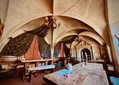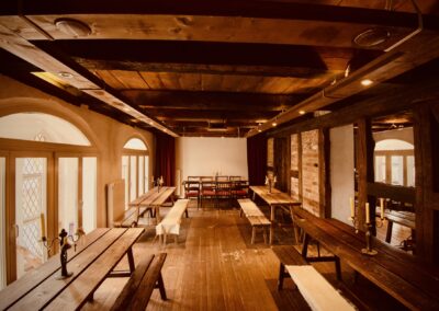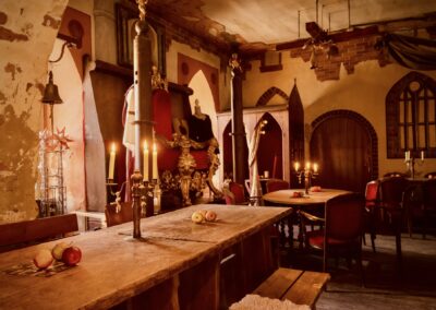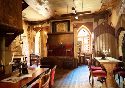 Meterdicke Wände, Kerzenbeleuchtung, Bleiglasfenster, Throngestühl, Kanzel, Beichtstuhl, Kamin und vieles mehr bilden den perfekten Rahmen, um mit uns zusammen ins Mittelalter einzutauchen.