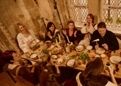 Festgelage mit mehreren Gängen, Gesang und Musik des Mittelalters, Gesöff aus dem Krug, Gedichte und frivole Reden, Met aus dem Horn, Beleuchtung nur mit Kerzen, Baden im Holzzuber (und Schwiegermutter oder Chef angekettet im Pranger!).
